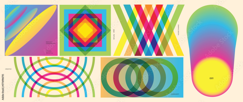 Fototapeta na wymiar - Abstract gradient geometric poster vector set with circles, waves, layered arches and optical shapes. Designed for modern posters, backgrounds, web banners, product packaging and digital design..