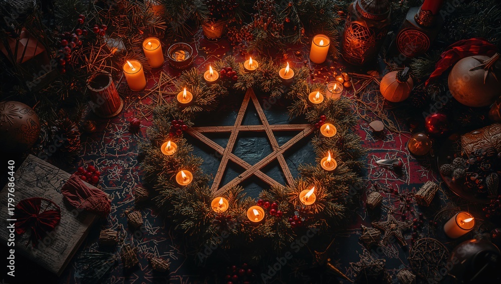 Fototapeta na wymiar - Pentagram with tealights, suitable for seasonal rituals, Yule.