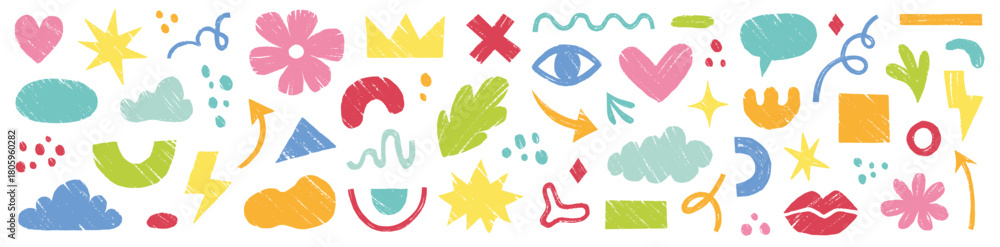 Fototapeta na wymiar - Crayon brush sticker cute organic shape set. Hand drawn sketch doodle scribble pastel brush geometric shape crayon effect background. Abstract arrow, circle, zigzag elements. Vector illustration.