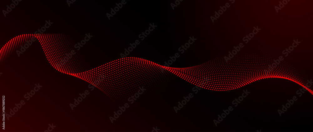 Fototapeta na wymiar - Red dotted wave pattern background. Dark red flowing particles concept. Tech halftone curved lines wallpaper for science banner, technology poster, presentation, booklet, flyer. Vector illustration.