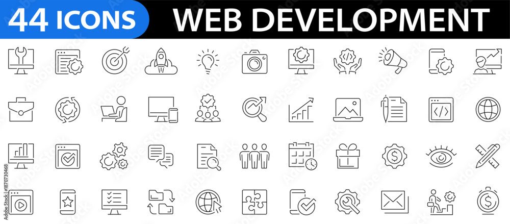 Fototapeta na wymiar - Web development 44 icon set. Technology development icons. Marketing, analytics, e-commerce, digital, management, seo and more. Editable stroke. Vector illustration.