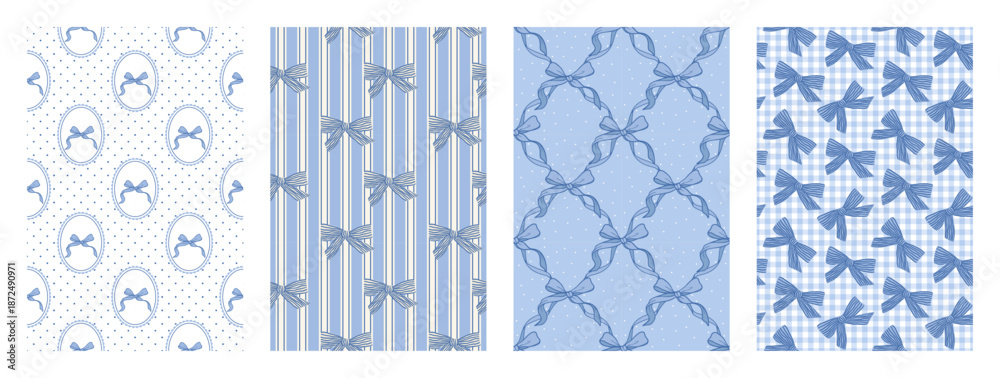 Fototapeta na wymiar - Set of Coquette seamless blue bow pattern. Striped, plaid and checkered repeating print for wrapping paper, fabric and textile. Hand drawn decorations. Flirtatious patterns. Vector illustration.