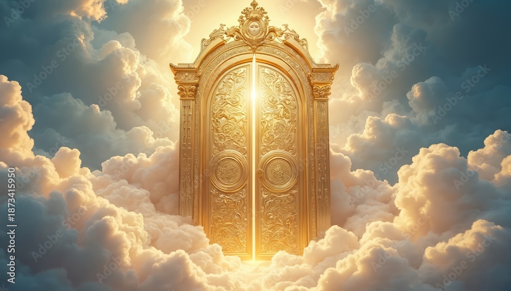 >Fototapety na wymiar>Wybrane motywy - zobacz więcej !>Pustynia>Majestic golden door to heaven set against fluffy clouds. Bright light emanates from behind the closed entrance. Divine illustration depicts spiritual afterlife concept dream fantasy.