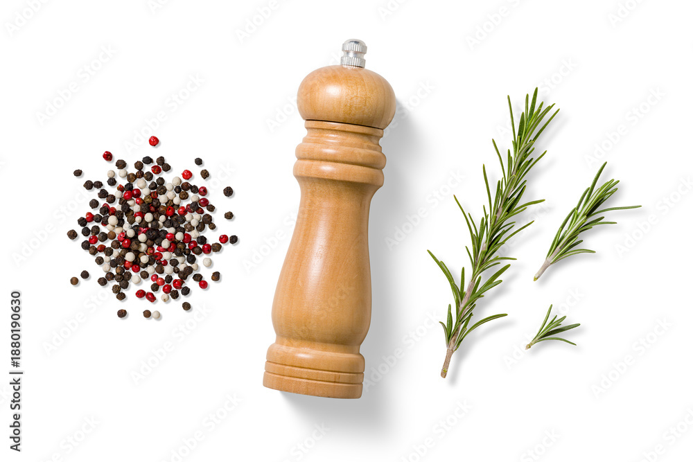 Fototapeta na wymiar - Top view of wooden pepper grinder with mixed black, red and white peppercorns and fresh rosemary sprigs, isolated on a transparent background. Ideal for food design, packaging, and culinary use..