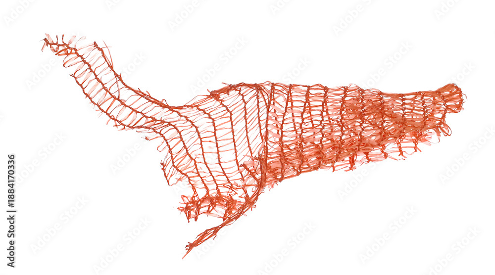 Fototapeta na wymiar - torn plastic fruit net flying, red bag isolated on white background and texture, design element, transparency.