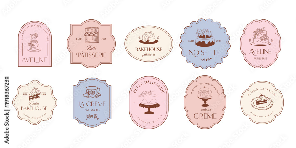 Fototapeta na wymiar - Retro pastry shop and bakery label set. Vintage illustrations of cakes and sweets for cafe logos and branding. .