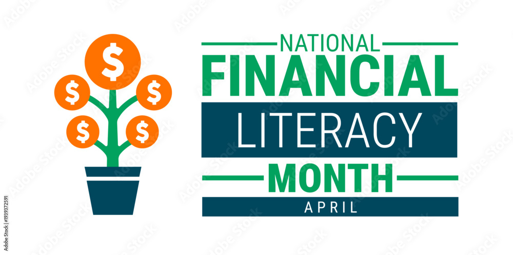 Fototapeta na wymiar - National Financial Literacy Month April Banner or background. Orange and Teal Graphic Promoting Financial Education, Money Management, and Wealth Growth with Savings, Investing, and Graduation.