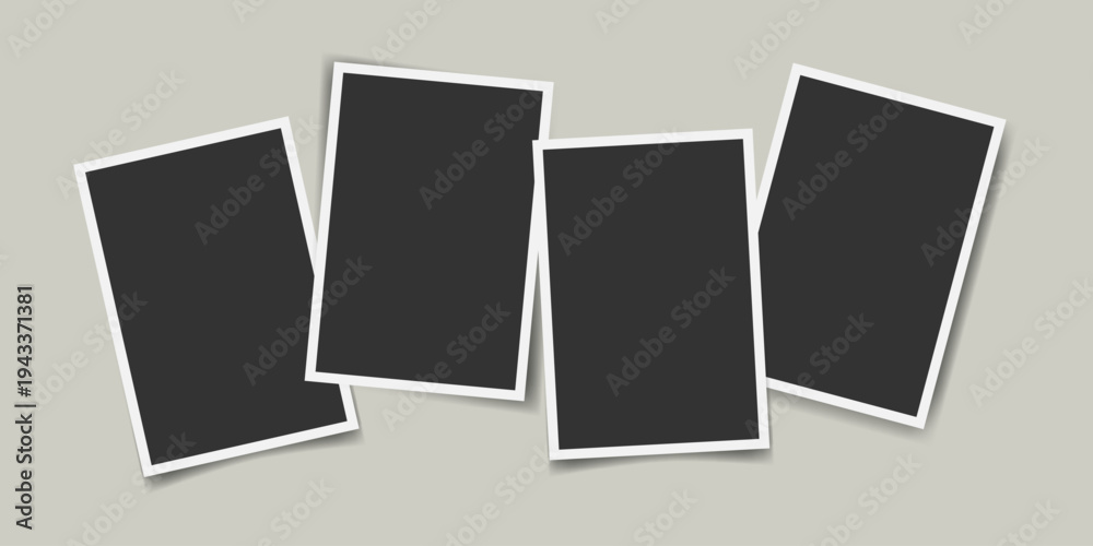 Fototapeta na wymiar - Realistic photo frame mockup with four vertical overlapping instant film prints. Empty placeholders for images. Vector template for photo collage, portfolio presentation, scrapbooking, social media.