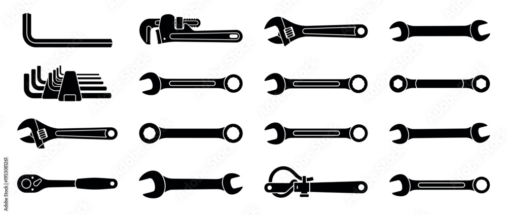Fototapeta na wymiar - Various black silhouette hand tools and wrenches, including adjustable, pipe, combination, and hex keys, presented in a clean, graphic style.