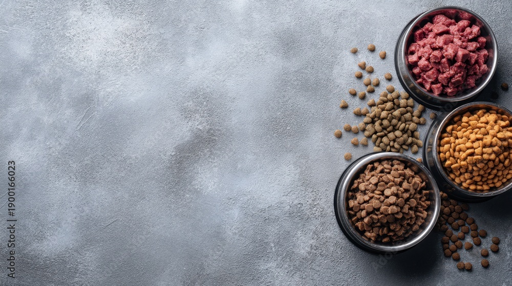 Fototapeta na wymiar - Assorted dry pet food kibbles in bowls on gray surface..