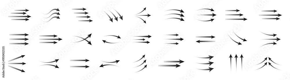 Fototapeta na wymiar - Air flow arrows set, wind direction stream lines, ventilation motion swirl symbols, minimal black airflow indicators isolated on transparent background.
