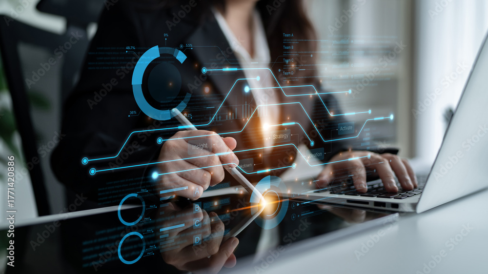 Fototapeta na wymiar - Dashboard for business intelligence and strategic planning. This workflow shows the process from insight and ideation to activation, enabling data-driven project management. Fermion.