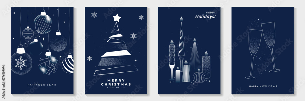 Fototapeta na wymiar - Happy New Year and Merry Christmas poster vector set. Navy champagne bottles, glasses and party confetti for celebration themes. Suitable for greeting cards, posters and digital media..