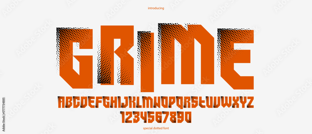 Fototapeta na wymiar - Halftone dotted futuristic cyberpunk font for logos and posters, vector brutal industrial typeface alphabet letters and numbers, urban technic future typography..