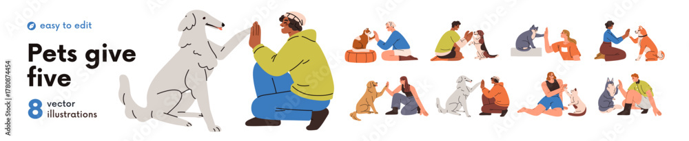 >Fototapety na wymiar>Wybrane motywy - zobacz więcej !>Rower>People giving high five to cute animals, cats and dogs set. Pet owners with companion puppies, kitties friends. Greeting with hands and paws. Flat vector illustrations isolated on white background.