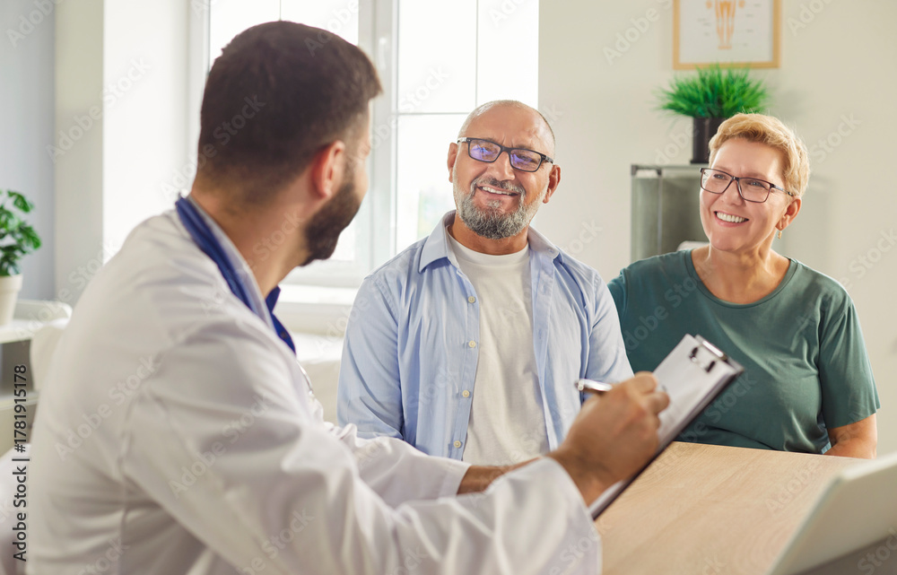 >Fototapety na wymiar>Wybrane motywy - zobacz więcej !>Rower>Doctor discusses treatment and care plans, reviews records and schedules followup with g senior couple in clinic consultation. Elderly happy patients talking with physician during medical exam.