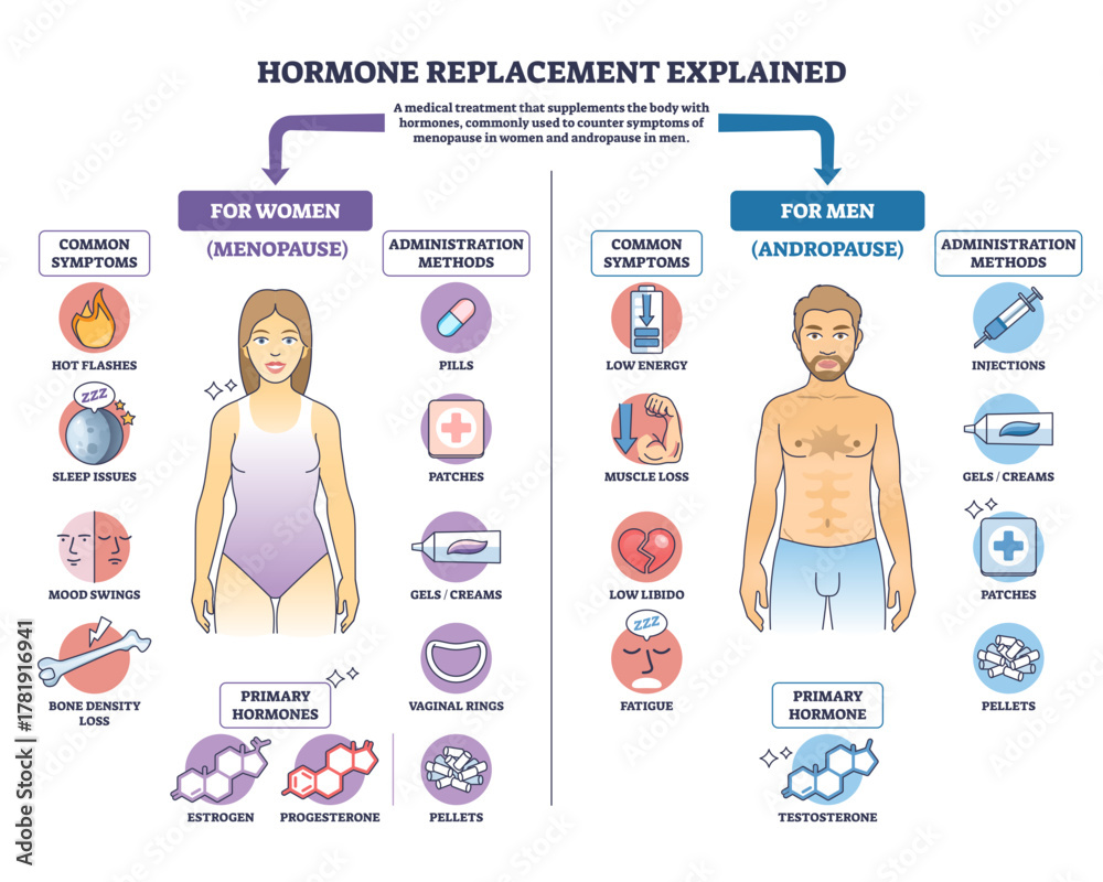 Fototapeta na wymiar - Hormone replacement explained, brief diagram comparing menopause and andropause symptoms, primary hormones and delivery methods, key objects, male figure, female figure, treatment icons..