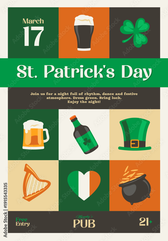 Fototapeta na wymiar - St. Patrick's Day party poster template with traditional Irish symbols in flat design style..