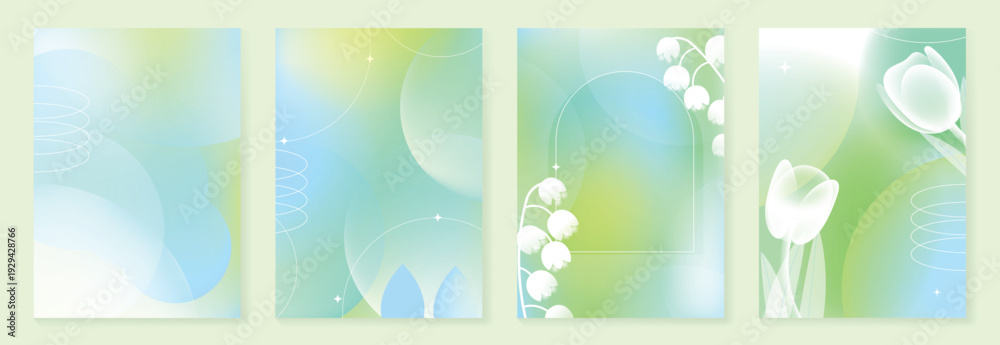 Fototapeta na wymiar - Spring and summer pastel floral vector background set with soft gradients, fresh greenery, and delicate flowers. Gentle fresh design for poster, invitation, web banner, packaging, and stationery..