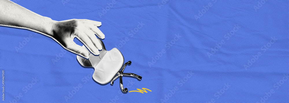 Fototapeta na wymiar - Workplace exclusion concept. Collage halftone hand dragging office chair away, job removal and corporate pressure. Vector illustration.
