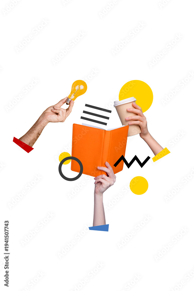 Fototapeta na wymiar - Vertical photo collage of hands hold book light bulb take away coffee cup leisure hobby bookworm idea drink isolated on painted background.