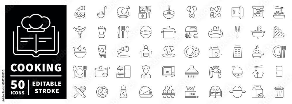 Fototapeta na wymiar - Cooking outline icon set: editable stroke thin line kitchen tools and food symbols.