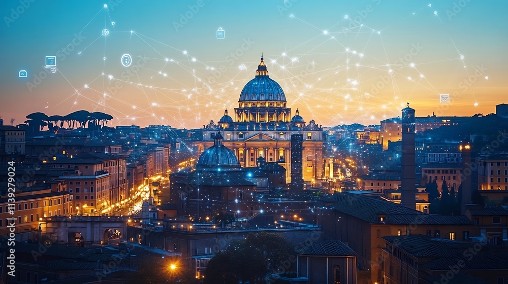 Fototapeta na wymiar - Futuristic Smart City Landscape with Digital Community in Rome.