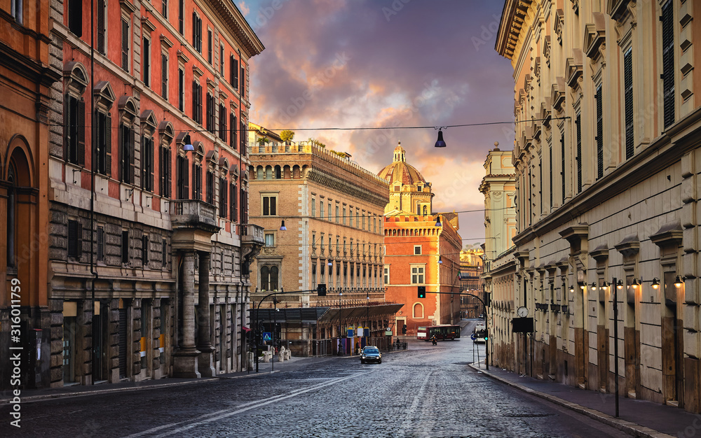 Fototapeta na wymiar - Rome, Italy. Deserted evening street of old town with road of paving stones and high houses. Picturesque landscape with sunset sky..