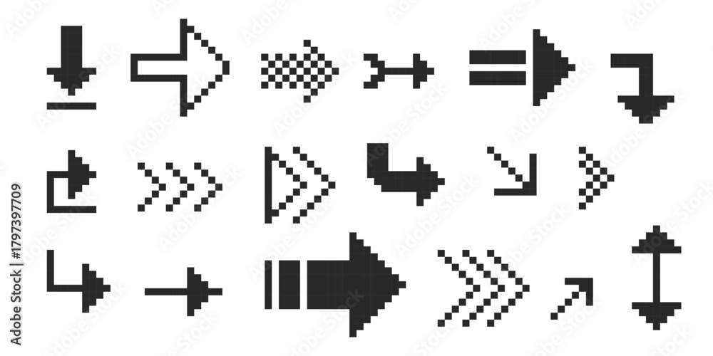 Fototapeta na wymiar - Pixel arrow set. Pixel art different directions 8 bit gaming console style sign. Interface icon. Collection.