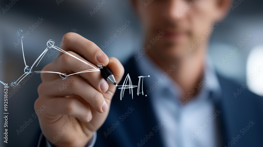 Fototapeta na wymiar - AI agent concept with faceless man writing line to command agentic artificial intelligence automation, node coding flow process, perform multi-step tasks, different software.
