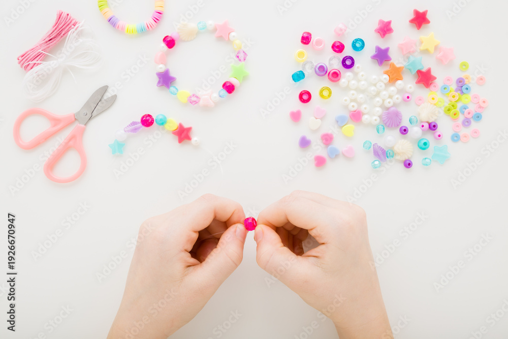 Fototapeta na wymiar - Girl hands making colorful bracelet on white table background. Creating different beaded jewellery. Little child handcraft. Closeup. Point of view shot. Top down view..