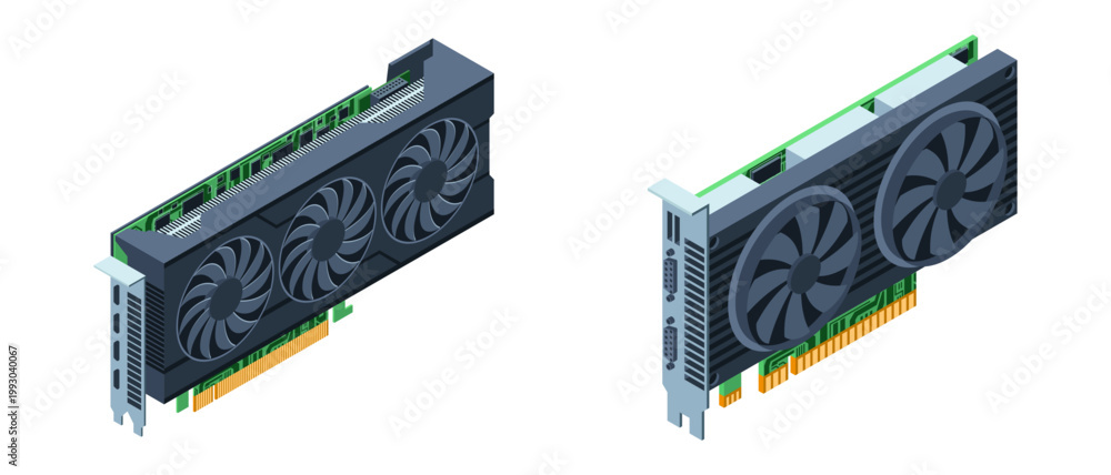 Fototapeta na wymiar - 3D isometric video graphic card. Video graphics card for cryptocurrency mining or gaming. GPU graphic card illustration. Personal computer hardware components.