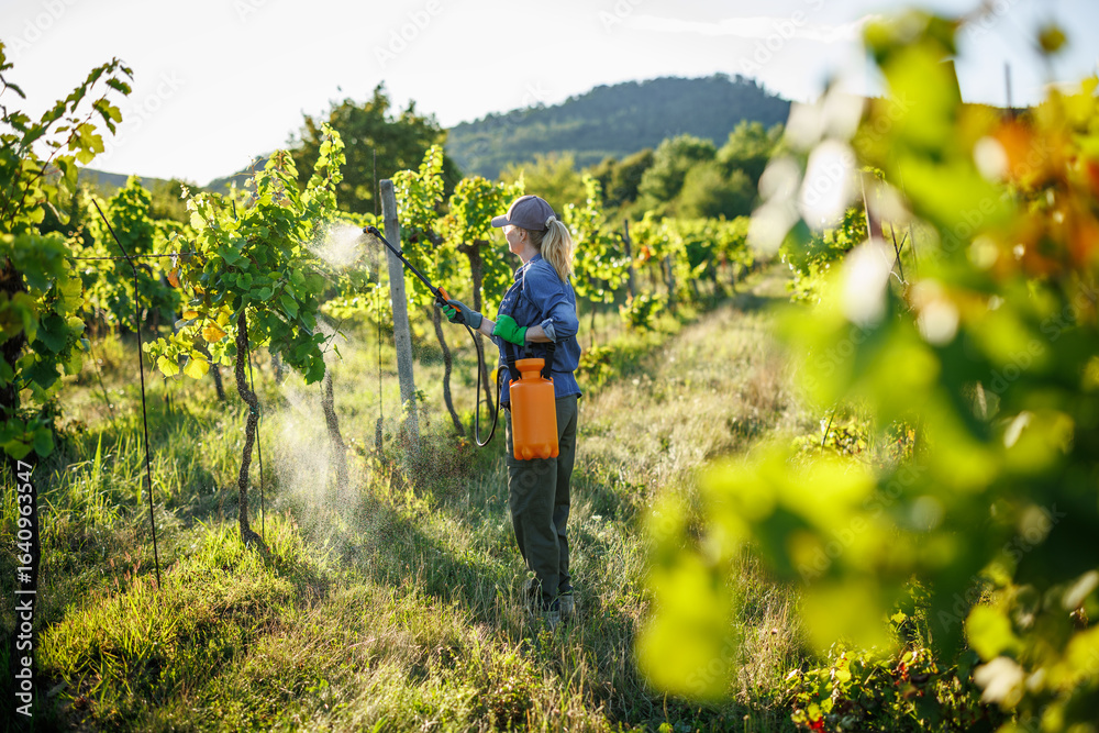 Fototapeta na wymiar - Vineyard woman farmer spraying grapevines with fungicide or pesticide to protect growth and harvest in summer viticulture routine.