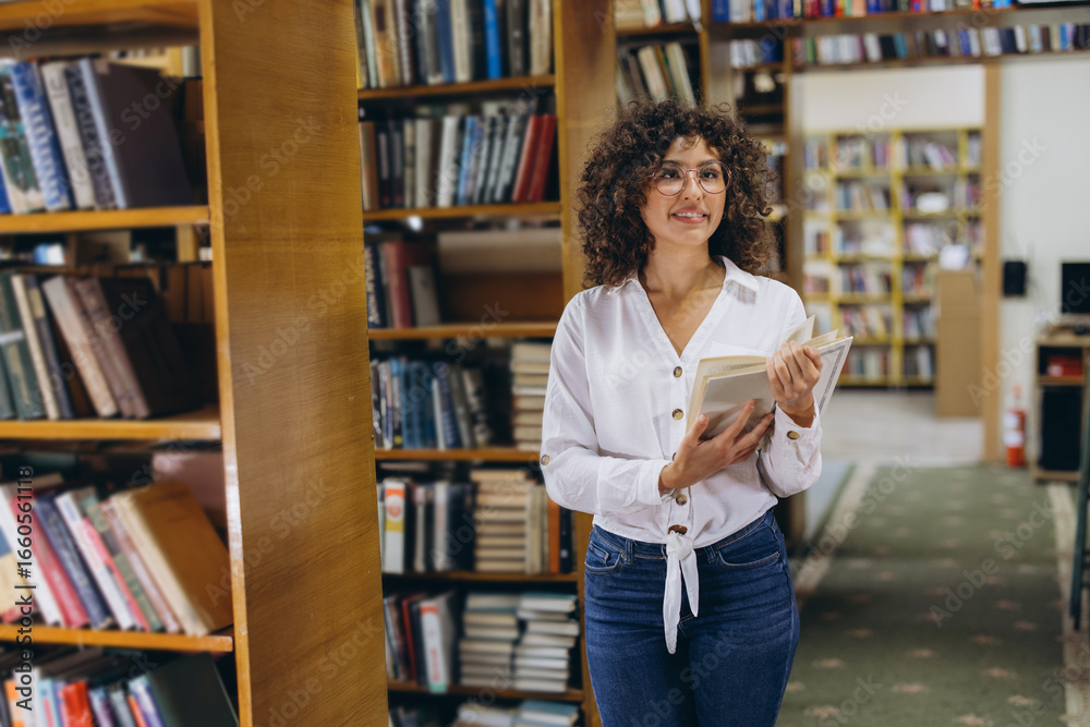 Fototapeta na wymiar - Young student holding a book and smiling in the library.