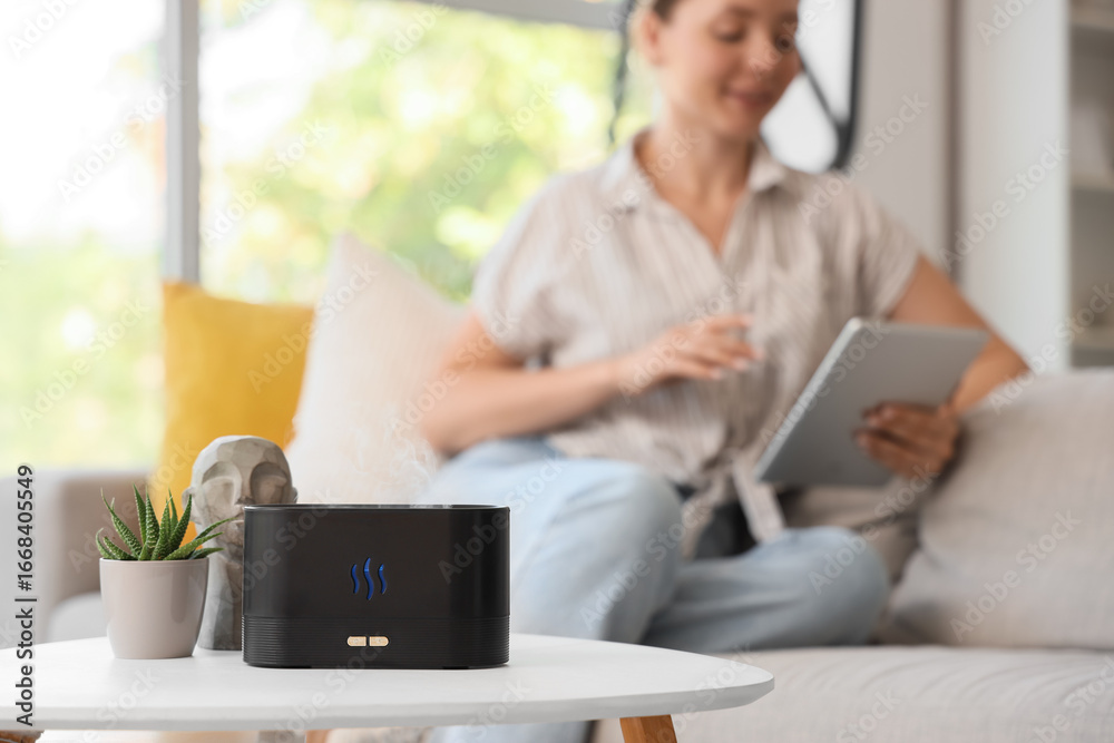 Fototapeta na wymiar - Air humidifier on table against woman using tablet computer at home, closeup.