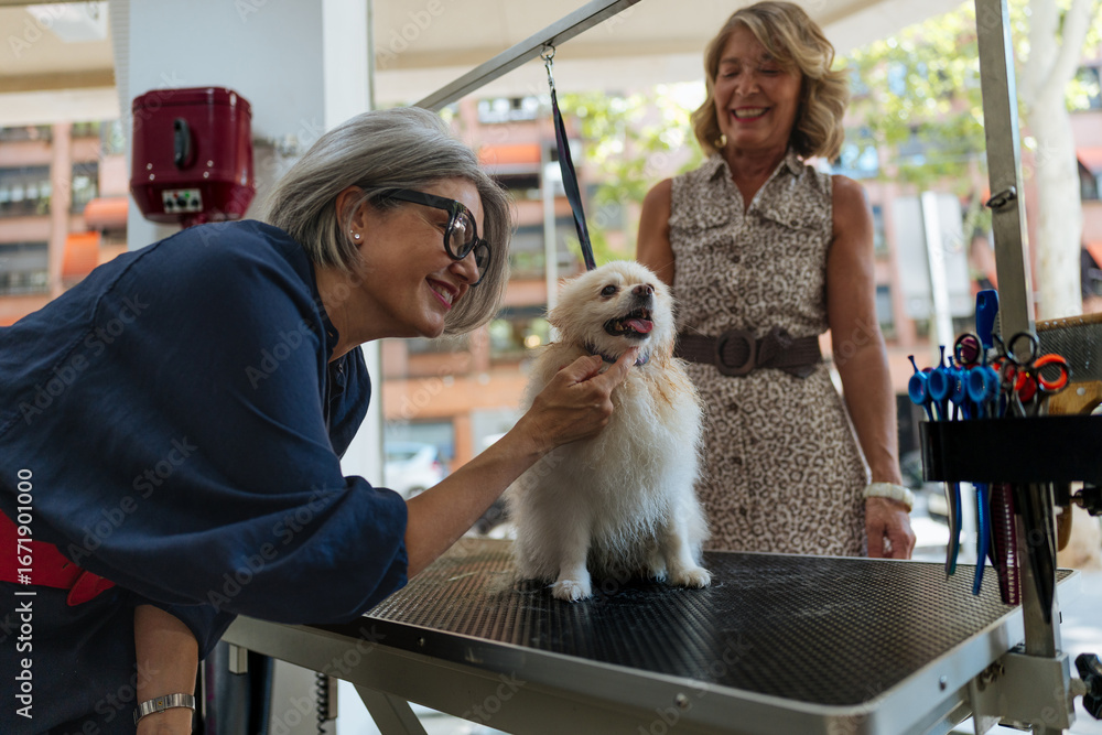 Fototapeta na wymiar - Dog groomer cuddling a Pomeranian spitz on the grooming table with its owner.