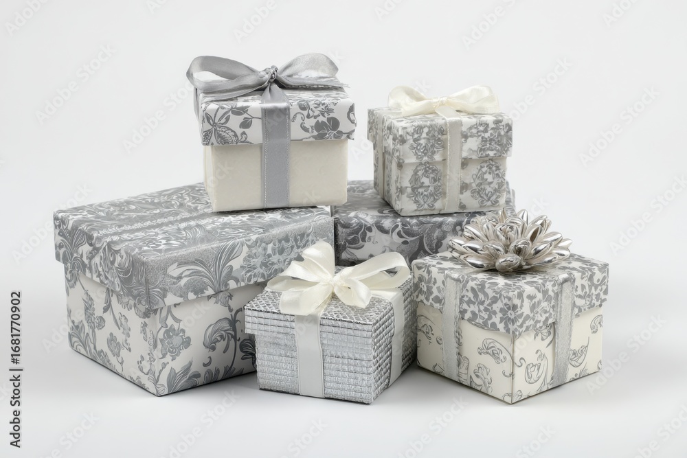 >Fototapety na wymiar>Wybrane motywy - zobacz więcej !>Samoloty>Stack of soft gray beige gift boxes tied silver bows. Joy, anticipation of receiving presents. Giftboxes heap neat stacked on white backdrop. Gift box set in large pile. Distinctive present boxes