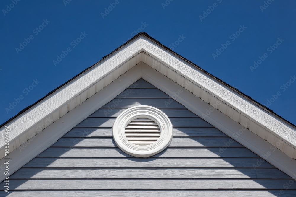 >Fototapety na wymiar>Wybrane motywy - zobacz więcej !>Samoloty>Gable roof circular vent allowing air circulation on clear day. Ventilation of the house. Fascia and Ridge. Grey metal tiles roof. Siding house exterior. Outdoor air conditioning. Architectural Detail