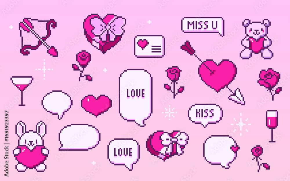 Fototapeta na wymiar - Cute 8 bit set with pixel valentine retro icons for romantic design - pink hearts, bunny with love, bow and arrow, rose and wine glass. Envelope and teddy bear element for dating game or greeting card.