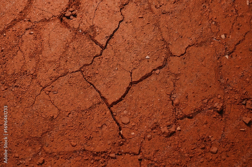 Fototapeta na wymiar - Natural floor backdrop featuring dry red clay soil texture.