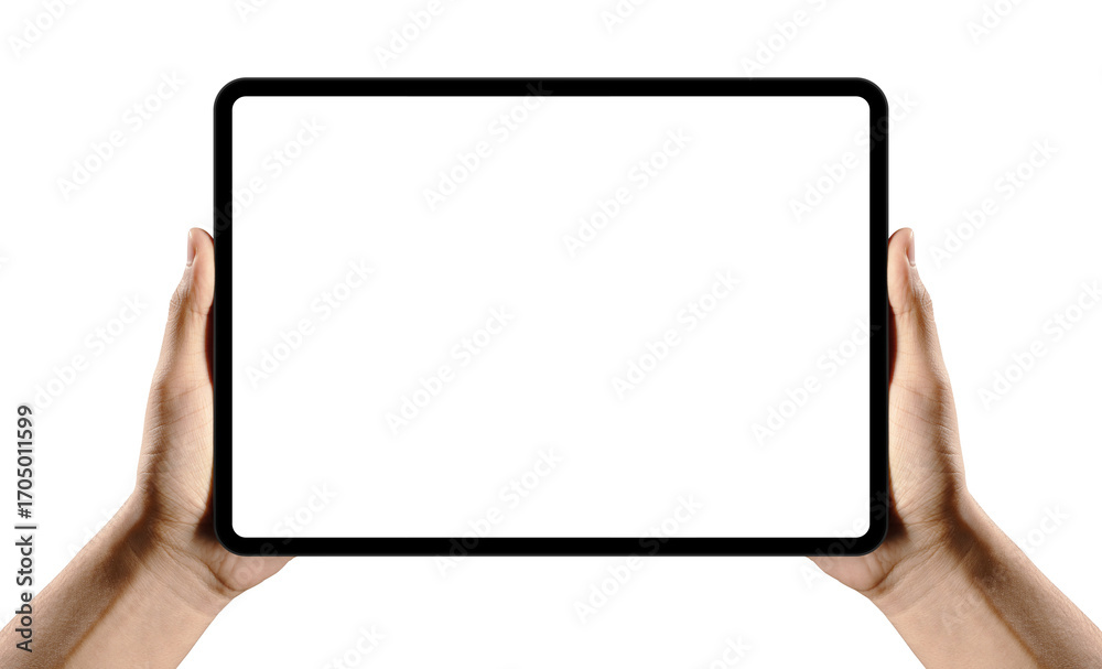 Fototapeta na wymiar - hands holding tablet mockup with blank screen isolated on transparent white background. Hand holding tablet display mockup.