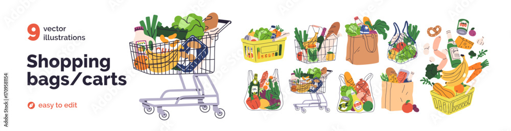 Fototapeta na wymiar - Shopping carts, paper bags, plastic and metal baskets from grocery store. Trolleys full of food products, purchases, vegetables, bread, fruits. Flat vector illustrations isolated on white background.