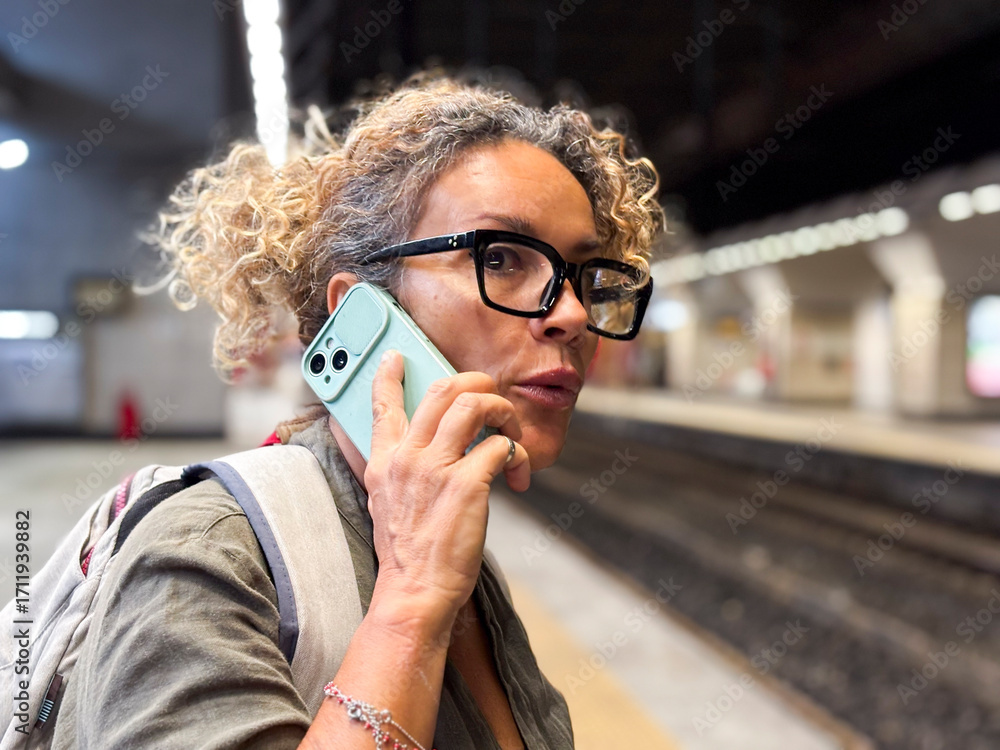 >Fototapety na wymiar>Wybrane motywy - zobacz więcej !>Samoloty>Middle-aged woman on phone in underground train station, worried and waiting for subway or train, showing concern, stress, anticipation and real life moments of urban commuting and everyday travel