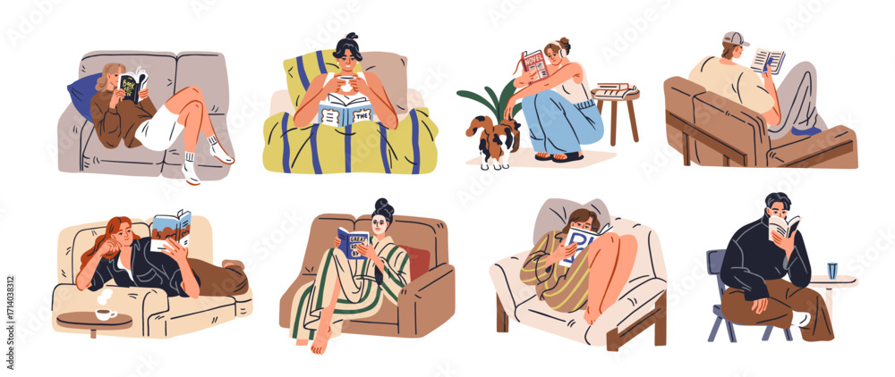 Fototapeta na wymiar - Reading at home set. People relaxing with book on sofa, armchair, bed. Readers enjoying calm leisure with fiction story, novel in cozy interiors. Flat vector illustrations isolated on white background.