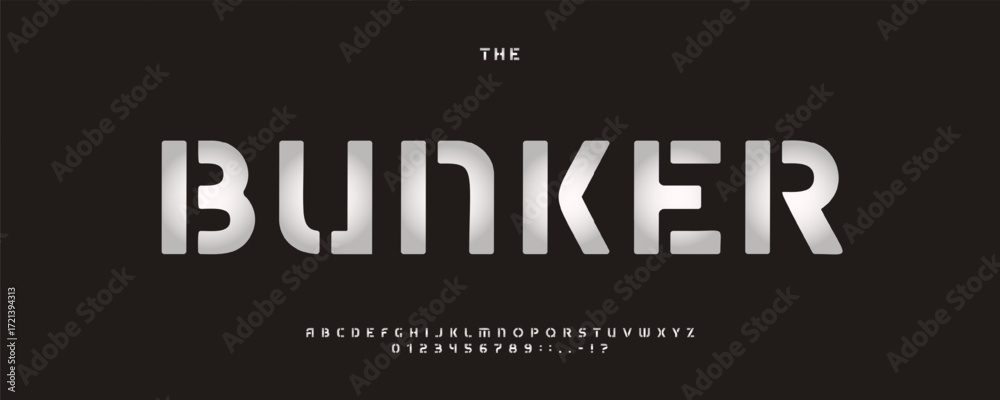 Fototapeta na wymiar - Bunker font, futuristic stencil typeface, bold industrial letters for Gaming title, military poster, tech logo, military army cover, UI label, sci-fi branding, trailer. Vector typeset.