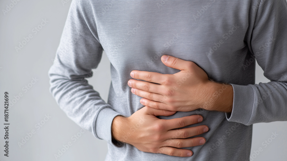 Fototapeta na wymiar - Man holding his stomach in pain, symbolizing abdominal discomfort, illness, and digestive health issues. .