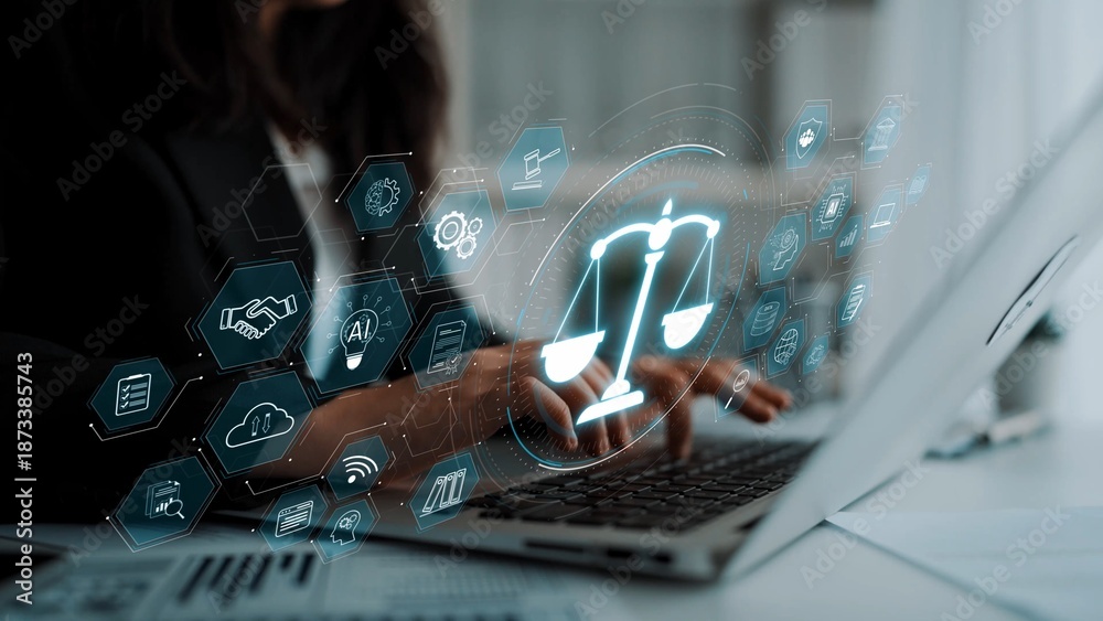 Fototapeta na wymiar - Artificial intelligence enhances legal systems through automation, AI decision support, and legal analytics. Legal system and justice AI transform operations. Marrow.