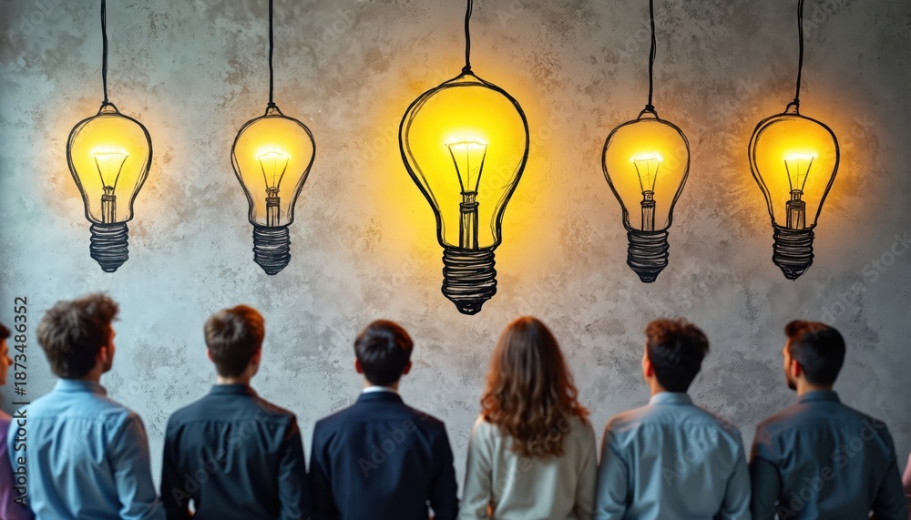 Fototapeta na wymiar - Group looks at lightbulb sketches on wall. Team thinks about project. Concept for team work ideas or education brainstorming. Brainstorming session with light bulbs on wall behind people..