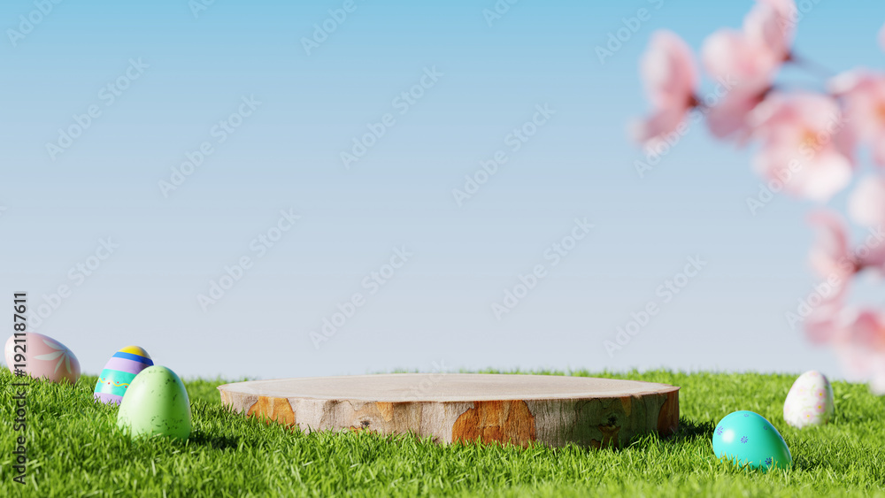 Fototapeta na wymiar - Easter wood podium on green grass with eggs and cherry blossoms. 3D rendering.