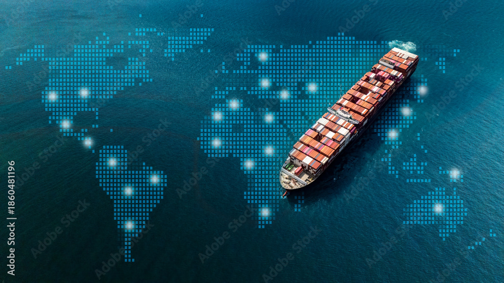 Fototapeta na wymiar - Aerial top-down view of a large container cargo ship sailing through turquoise ocean waters logistics, transportation and international shipping routes..